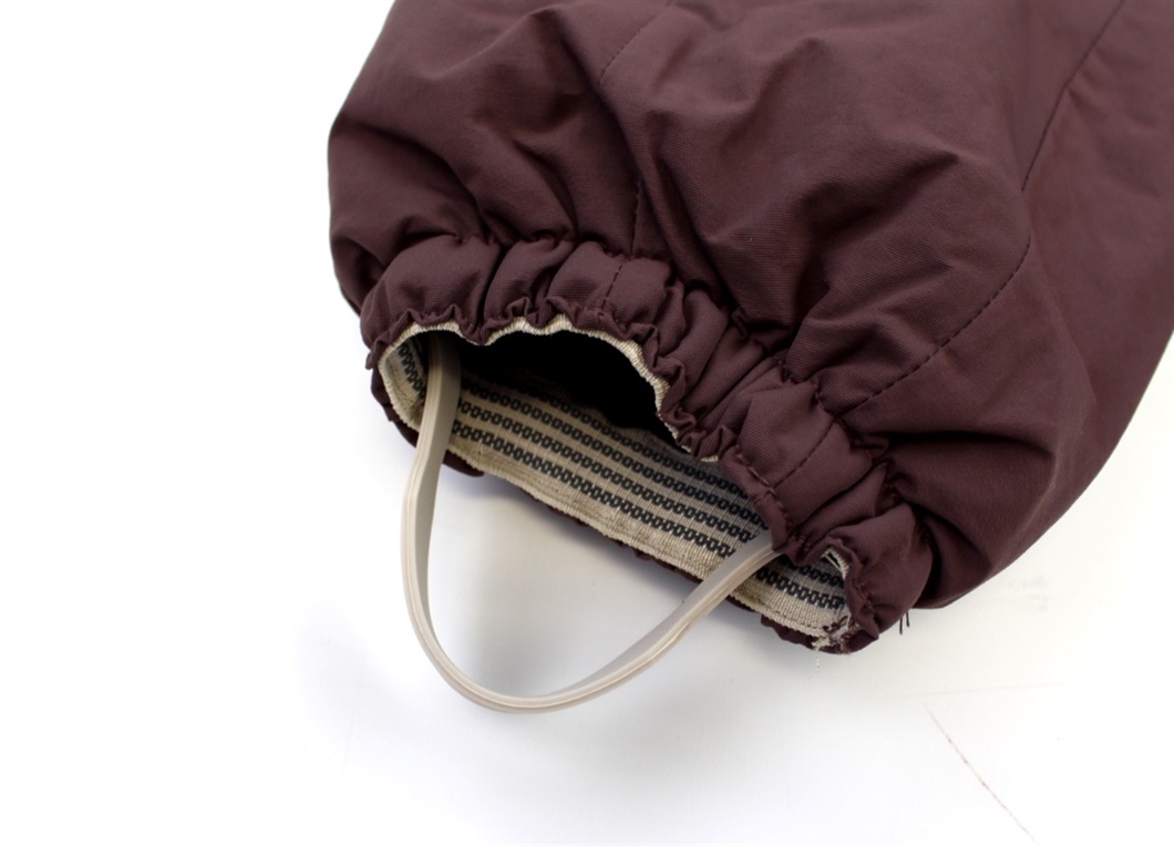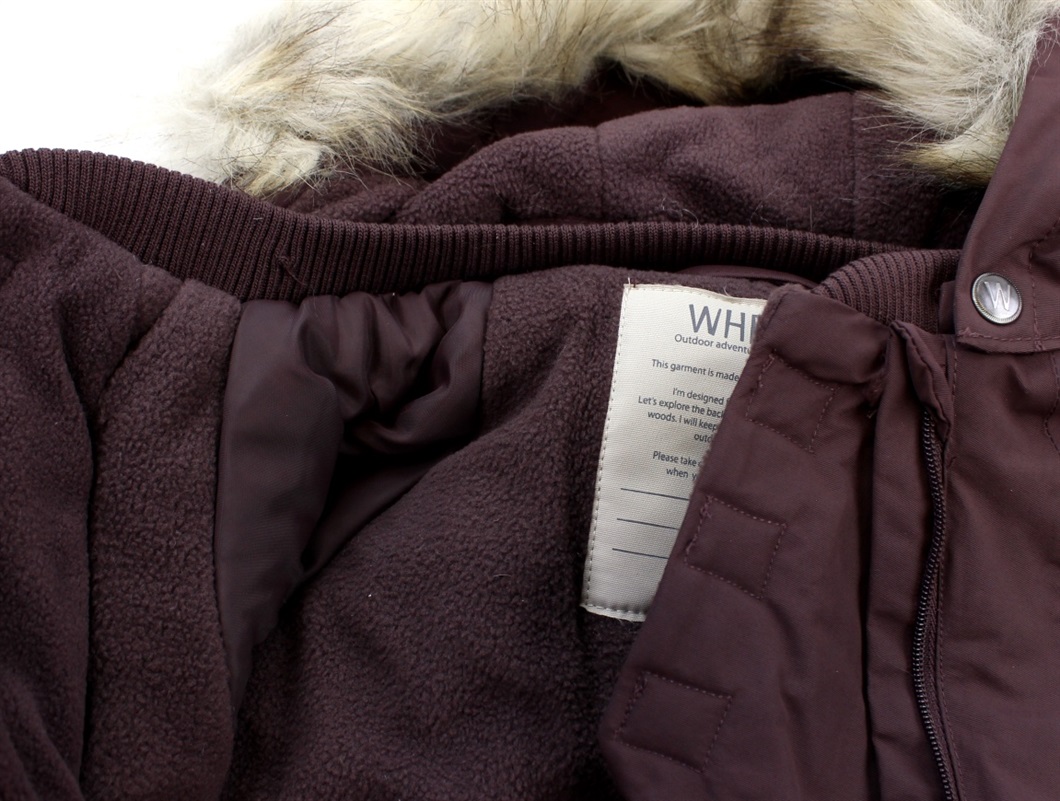 Flyverdragt i farven eggplant fra Wheat. Flyverdragten har en aftagelig hætte med trykknapper og syntetisk pels, som kan tages af med knapper.