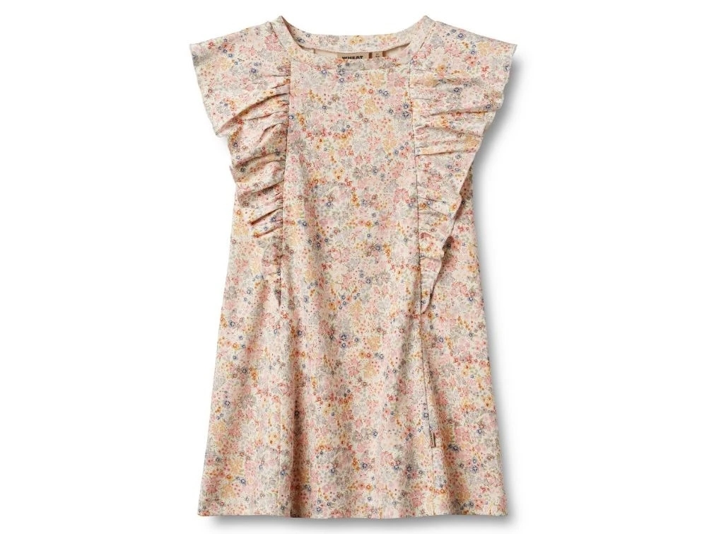 Let og luftig kjole fra Wheat i blød, økologisk bomuld med et fint blomsterprint i lækre lyserøde, lyseblå og lysegule nuancer. Kjolen har en løs pasform med små flæsedetaljer ved ærmegab og ned langs siderne, der giver et sødt og feminint udtryk.