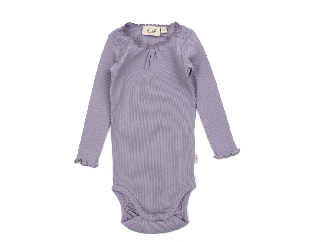 Wheat's langærmede rib body i farven lavender med blondekant er et sødt valg til din baby.