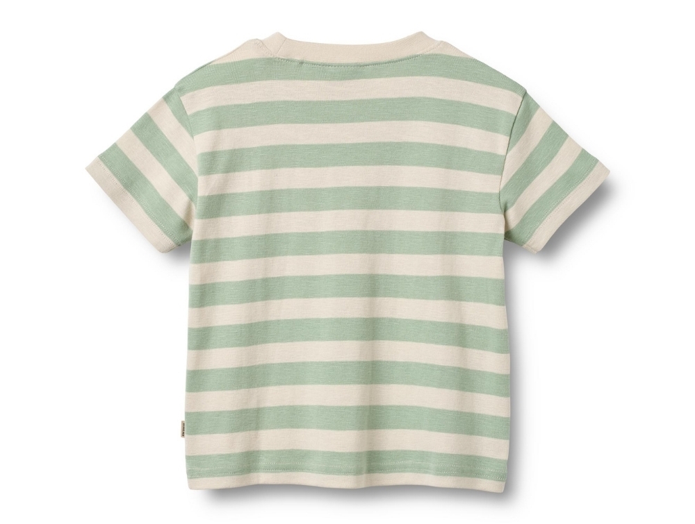 Kortærmet t-shirt med mintgrønne og råhvide striber (mint stripe) fra Wheat.