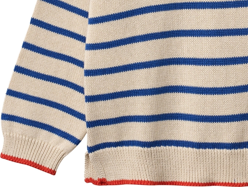 Striktrøje i beige nuance med blå striber og røde detaljer (true blue stripe) fra Wheat.