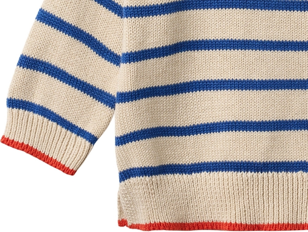 Striktrøje i beige nuance med blå striber (true blue stripe) og røde detaljer fra Wheat.