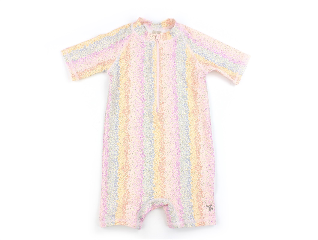 Badedragt med korte ærmer og ben i printet rainbow flowers fra Wheat.