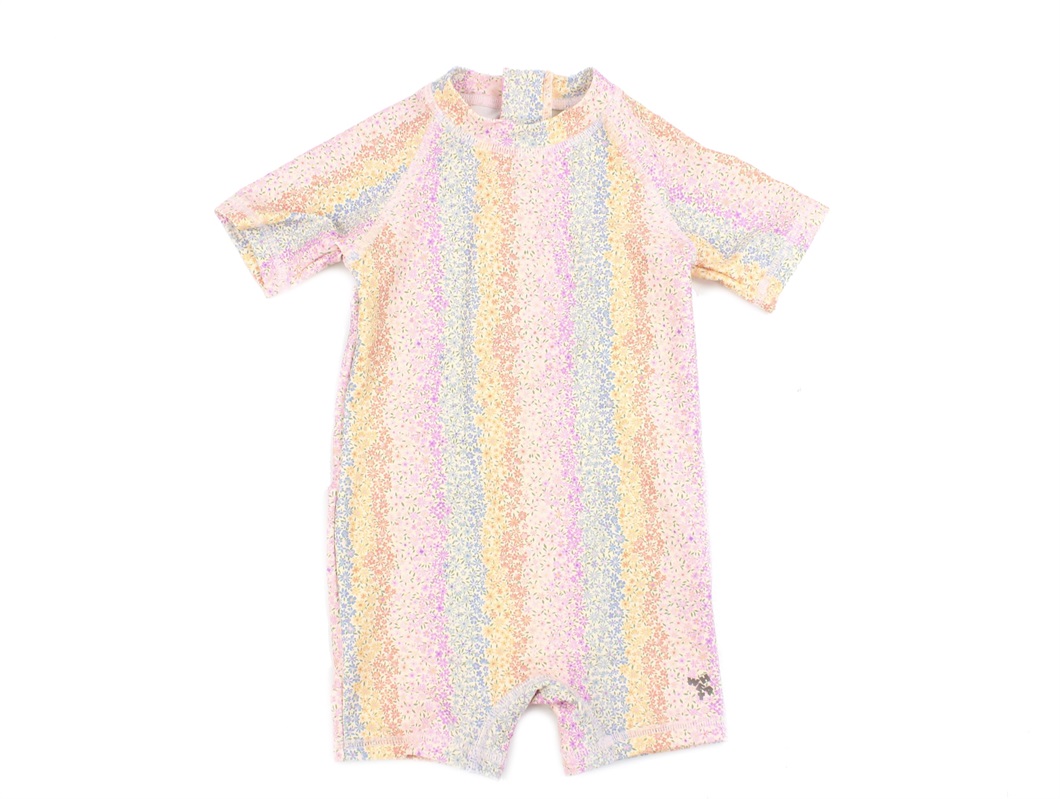 Badedragt med korte ærmer og ben med printet rainbow flowers fra Wheat.