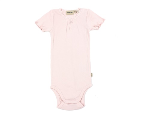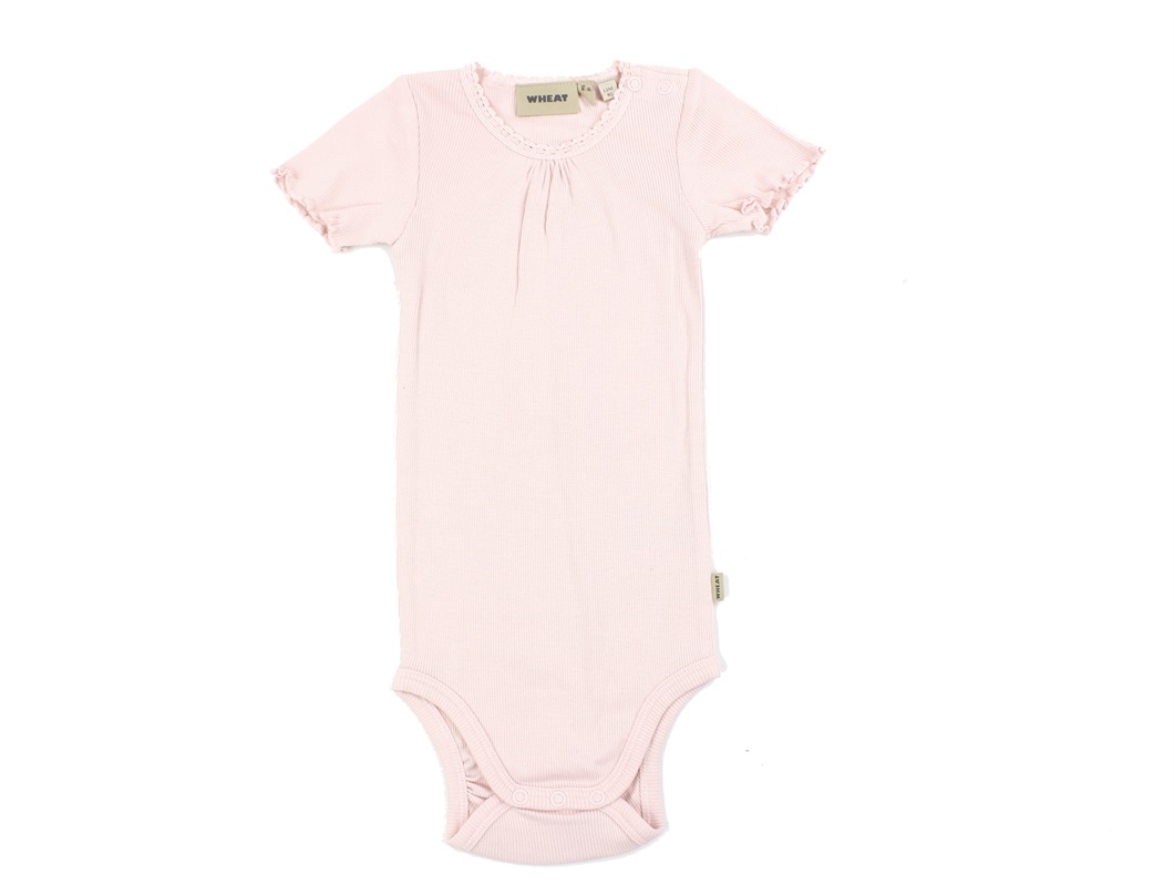 Kortærmet bodystocking i rib i farven rose ballet med blondekant i halsåbning fra Wheat.