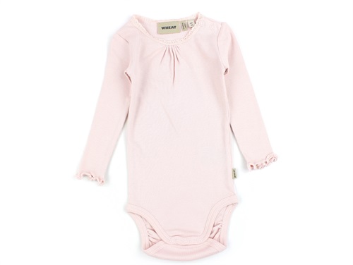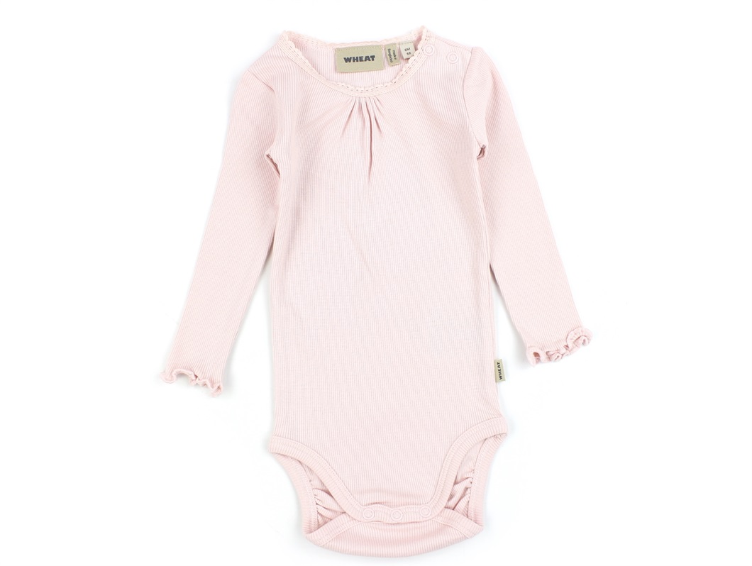 Langærmet body i rib i farven rose ballet med blondekant i halsåbning fra Wheat.