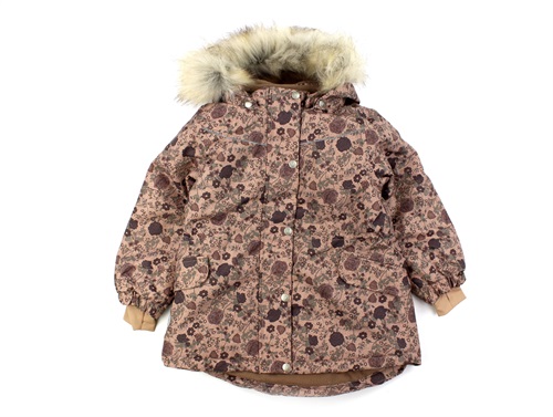 Vinterjakke i farven rose dawn flowers med blomsterprint fra Wheat. Jakken har aftagelig hætte med trykknapper og syntetisk pels, som sidder fast med knapper.