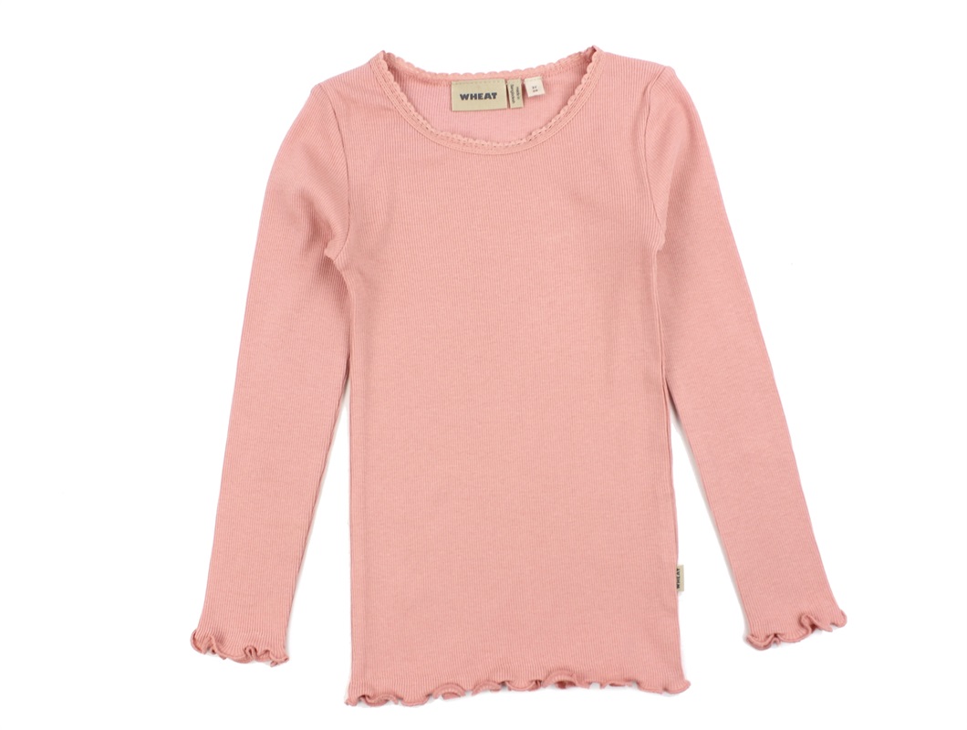 Langærmet top i rib i farven rosette med blondekant i halsåbning fra Wheat.