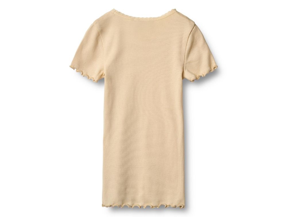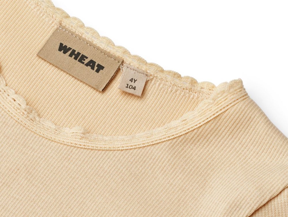 Fin og strækbar ribbet top fra Wheat i en smuk lys gul nuance med fin blondedetalje ved halsudskæringen. Toppen har en tætsiddende pasform og er lavet i en blød blanding af økologisk bomuld, Lenzing™ modal og elastan, hvilket gør den behagelig at have på. T-shirten har korte ærmer og overlockede kanter ved ærmer og bund, der giver et enkelt og elegant udtryk.
