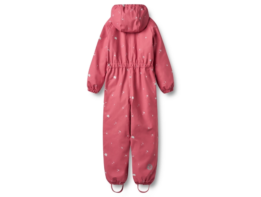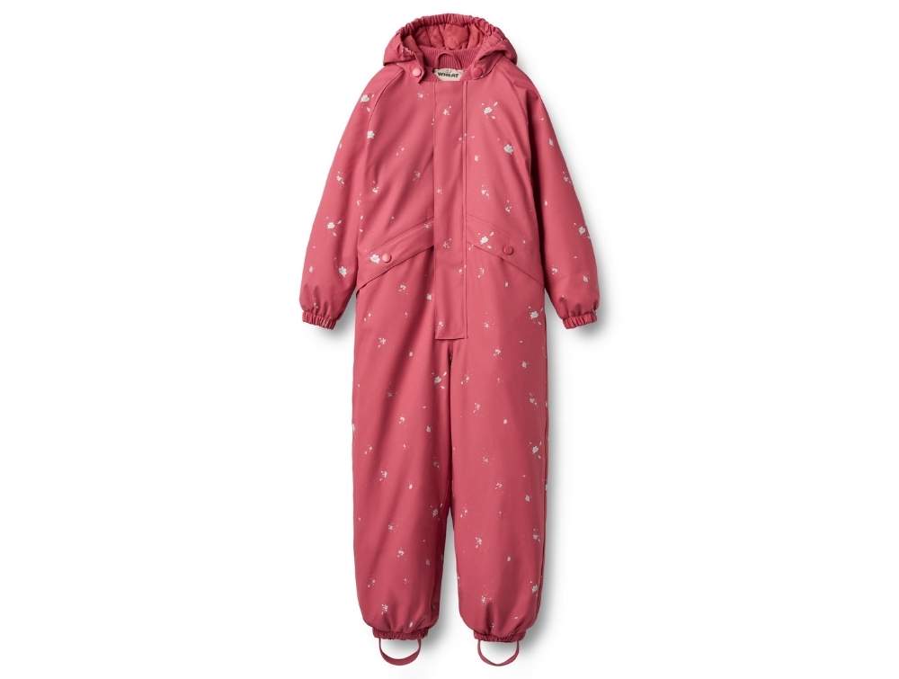 Termoregndragt i pink nuance (floating flowers) med blomsterprint fra Wheat med quiltet foer, seler og svejsede sømme – ideel som overgangsdragt.