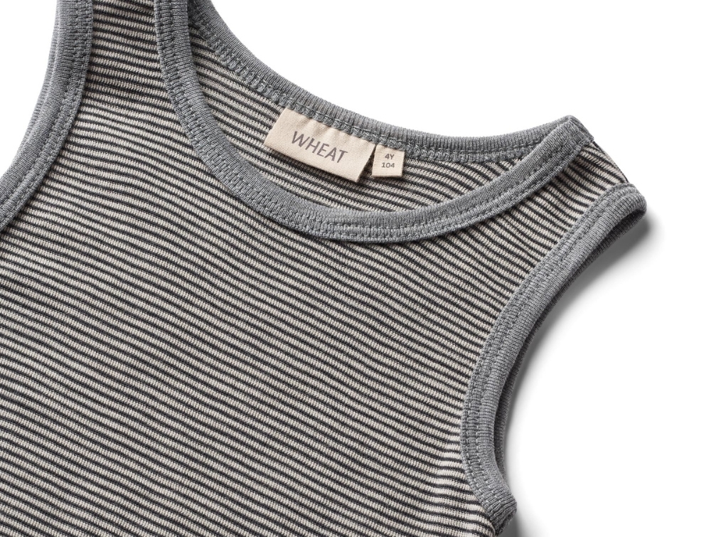 Wheat Wool tanktop navy stripe set forfraWheat Wool tanktop navy stripe set bagfraWheat Wool tanktop navy stripe tæt på halsudskæring