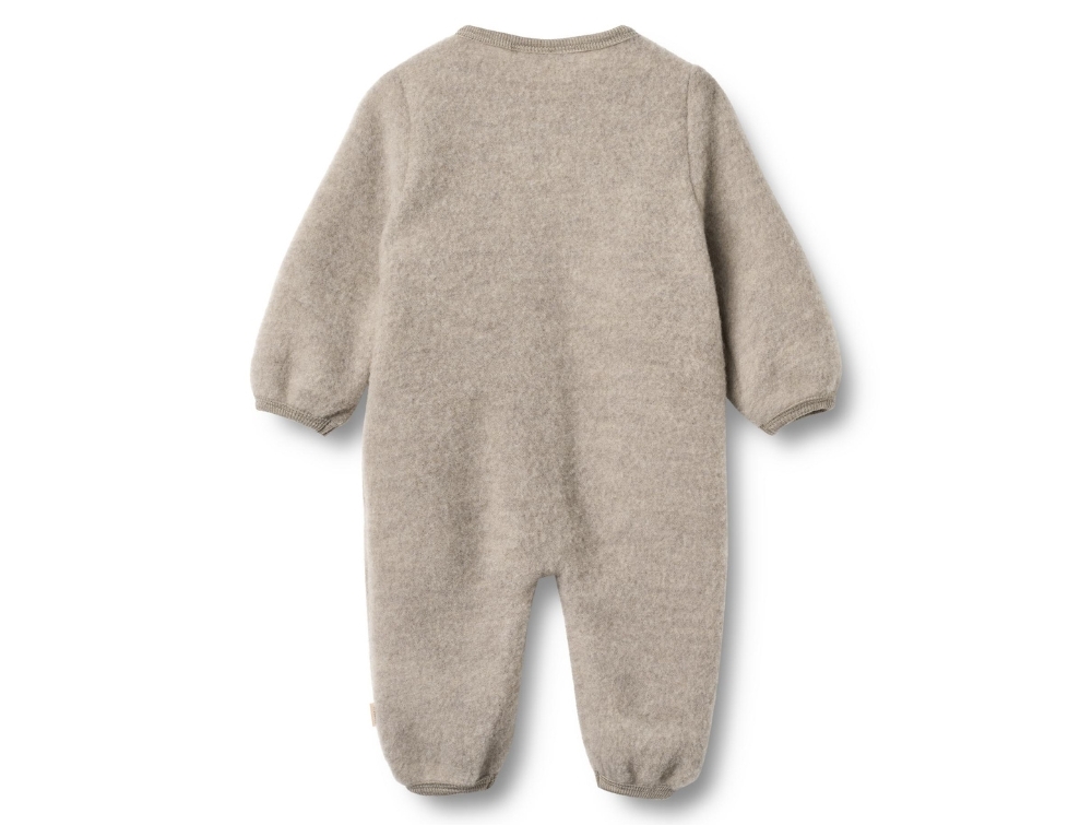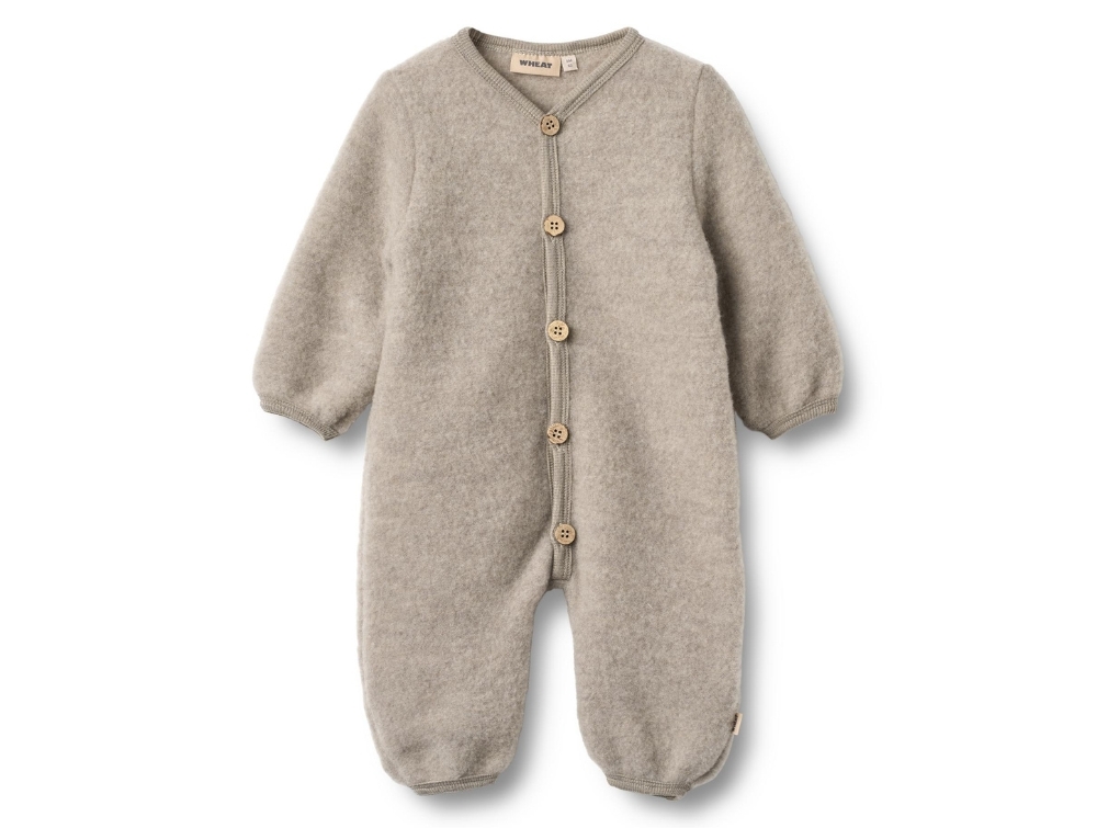 Uldfleece køredragt i meleret beige nuance (khaki melange) fra Wheat. Blød og praktisk heldragt med knaplukning foran.