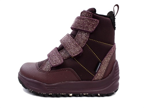 Vinterstøvle i farven fudge (lilla) med glimmer fra Woden. Støvlerne lukkes nemt med velcro.
