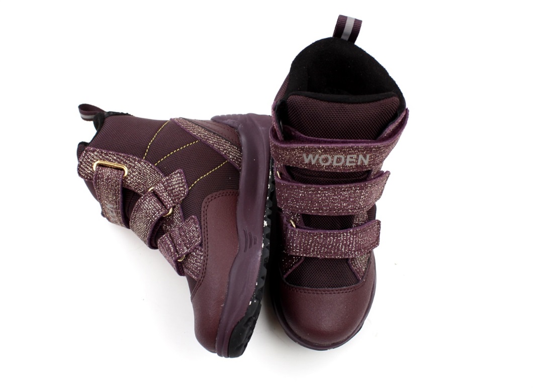 Vinterstøvle i farven fudge (lilla) med glimmer fra Woden. Støvlerne lukkes nemt med velcro.