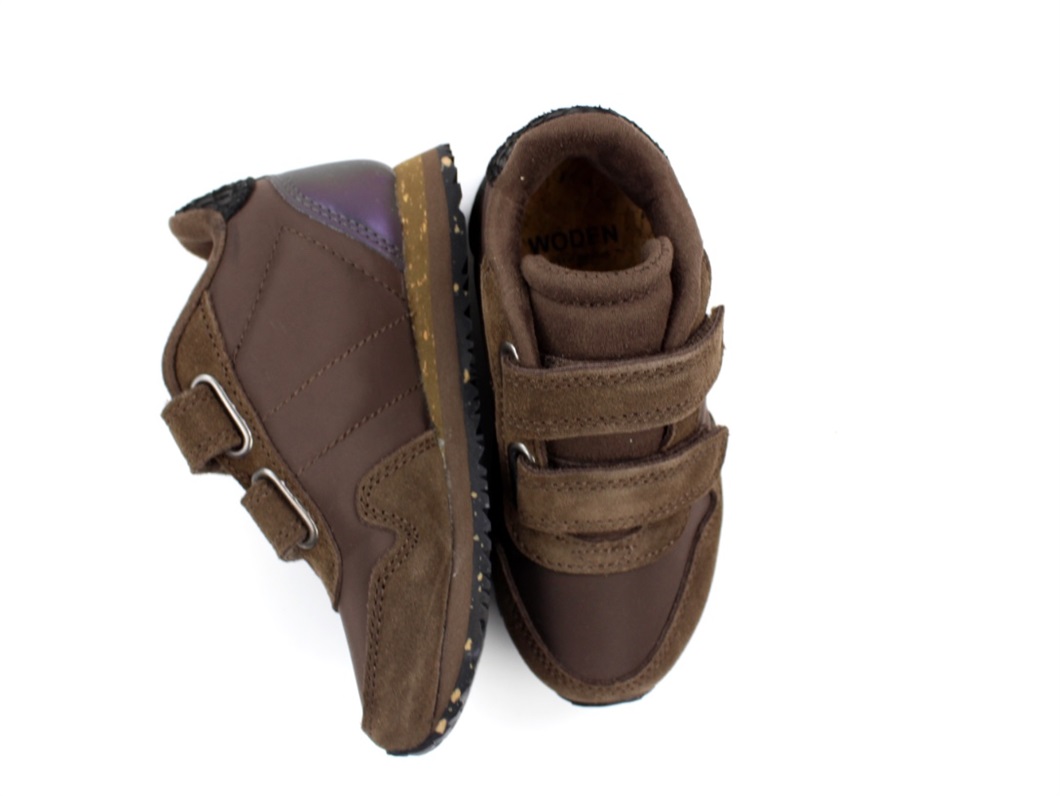 Sneakers i farven chestnut fra Woden med refleks på hælkappen. Skoene lukkes nemt med velcro.