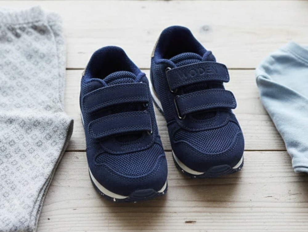 Navyfarvede sneakers fra Woden. Skoene lukkes nemt med velcro.