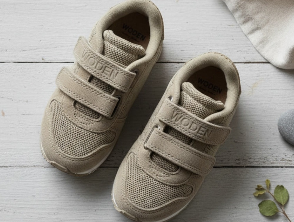 Sneakers i farven silver mink fra Woden. Skoene lukkes nemt med velcro.