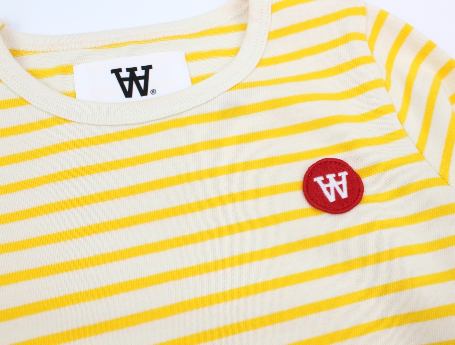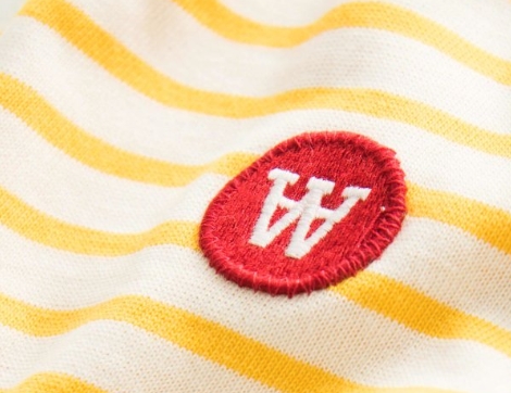 Råhvid bluse med gule striber og dobbelt A patch på venstre bryst fra Wood Wood.