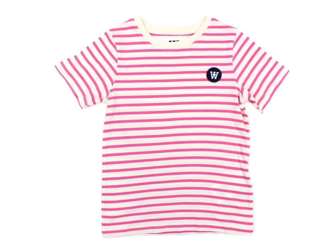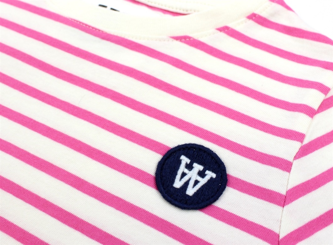 Råhvid t-shirt med pink striber og navyfarvet/hvidt dobbelt A patch på venstre bryst fra Wood Wood.