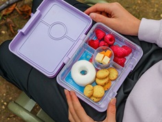 En Yumbox snack box er en kompakt madkasse med tre rum, der gør det nemt at pakke små mellemmåltider til børn. Den er ideel til frugt, grøntsager, kiks, nødder eller lidt yoghurt – og er særligt god, når du ikke har brug for en fuld madpakke. Med sin tætsluttende låg og lækagesikre rum kan du sagtens sende våde og tørre snacks med uden at bekymre dig om spild i tasken.