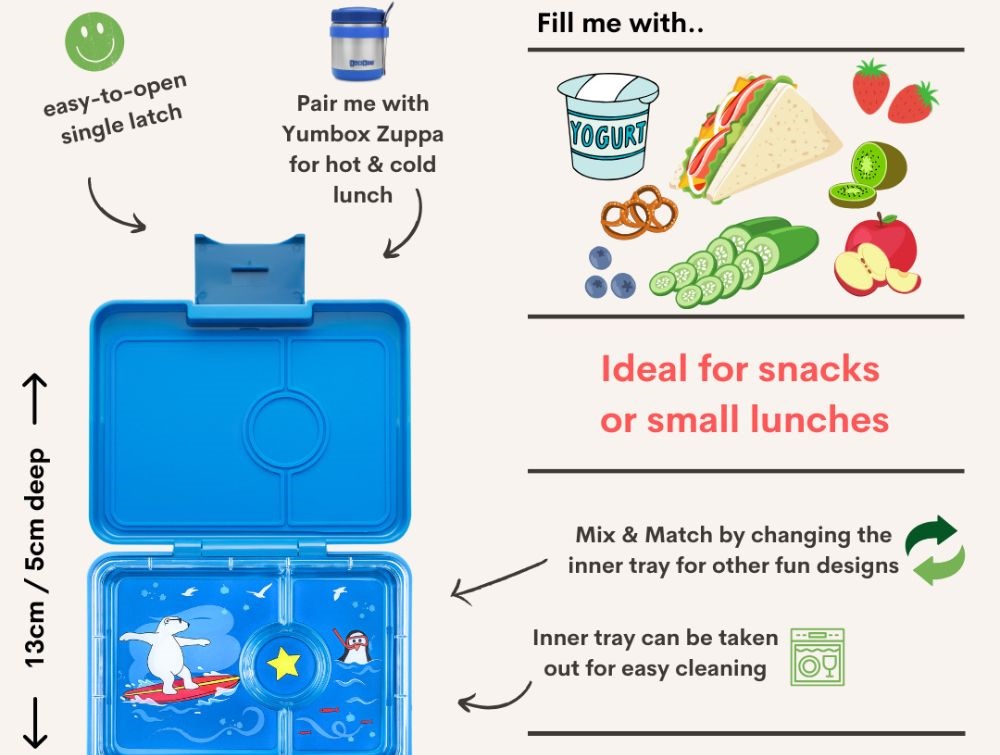 Bento madkasse med 3 rum i farven surf blue med skønt print i inderbakken fra Yumbox. Yumbox Snack børnemadkassen er den perfekte løsning til børnenes snacktid eller mindre frokostmadpakke! Yumbox Snack er den mindste madkasse fra Yumbox. Perfekt til f.eks. dage, hvor dit barn ikke behøver at medbringe en fuld frokost. Eller til en lækker snack på farten. "Bento" refererer i denne sammenhæng til en madkasse med rumopdeling, inspireret af de traditionelle japanske bento-bokse. Bento-madkasser er designet til at holde forskellige fødevarer adskilt, så de ikke blandes. Med dens smarte, børnevenlige design og praktiske opdelinger holder den maden frisk og lækker hele dagen lang. Tilføj nødder, knækbrød, frugt, grøntsager, yoghurt eller endda en dip (dog ikke vand og lign.). Yumbox er helt tæt på grund af silikoneforseglingen mellem rummene. Inderbakken kan tages ud og sættes i opvaskemaskinen (øverste kurv). For at forlænge levetiden af silikoneforseglingen anbefaler vi, at madkassen vaskes i hånden. Fri for BPA, PVC og ftalater. Vægt: 360 gram