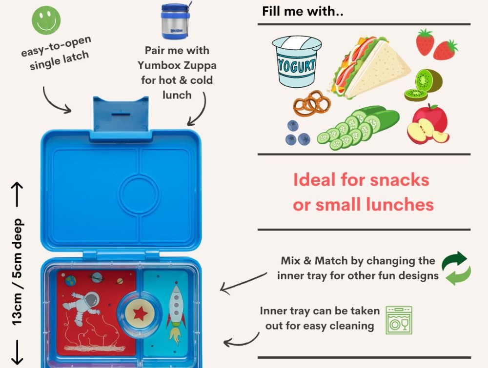 Bento madkasse med 3 rum i farven surf blue med raketprint i inderbakken fra Yumbox. Yumbox Snack børnemadkassen er den perfekte løsning til børnenes snacktid eller mindre frokostmadpakke! Yumbox Snack er den mindste madkasse fra Yumbox. Perfekt til f.eks. dage, hvor dit barn ikke behøver at medbringe en fuld frokost. Eller til en lækker snack på farten. "Bento" refererer i denne sammenhæng til en madkasse med rumopdeling, inspireret af de traditionelle japanske bento-bokse. Bento-madkasser er designet til at holde forskellige fødevarer adskilt, så de ikke blandes. Med dens smarte, børnevenlige design og praktiske opdelinger holder den maden frisk og lækker hele dagen lang. Tilføj nødder, knækbrød, frugt, grøntsager, yoghurt eller endda en dip (dog ikke vand og lign.). Yumbox er helt tæt på grund af silikoneforseglingen mellem rummene. Inderbakken kan tages ud og sættes i opvaskemaskinen (øverste kurv). For at forlænge levetiden af silikoneforseglingen anbefaler vi, at madkassen vaskes i hånden. Fri for BPA, PVC og ftalater. Vægt: 360 gram