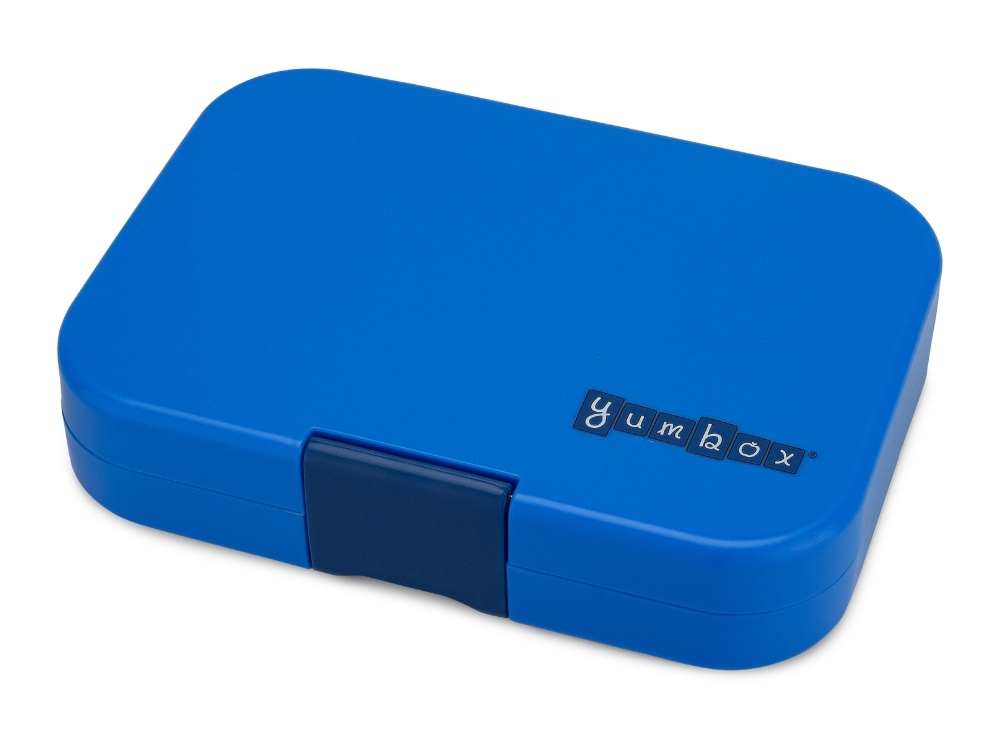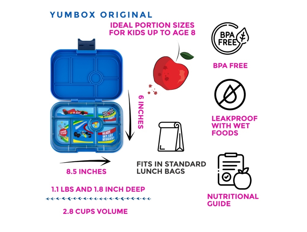 Yumbox Original madkasse i blå med åben låg og raketprint i inderbakkenYumbox Original madkasse i blå fyldt med snacks og grøntsagerYumbox Original madkasse med grafisk oversigt over funktioner og målYumbox Original madkasse i blå med lukket låg og logo