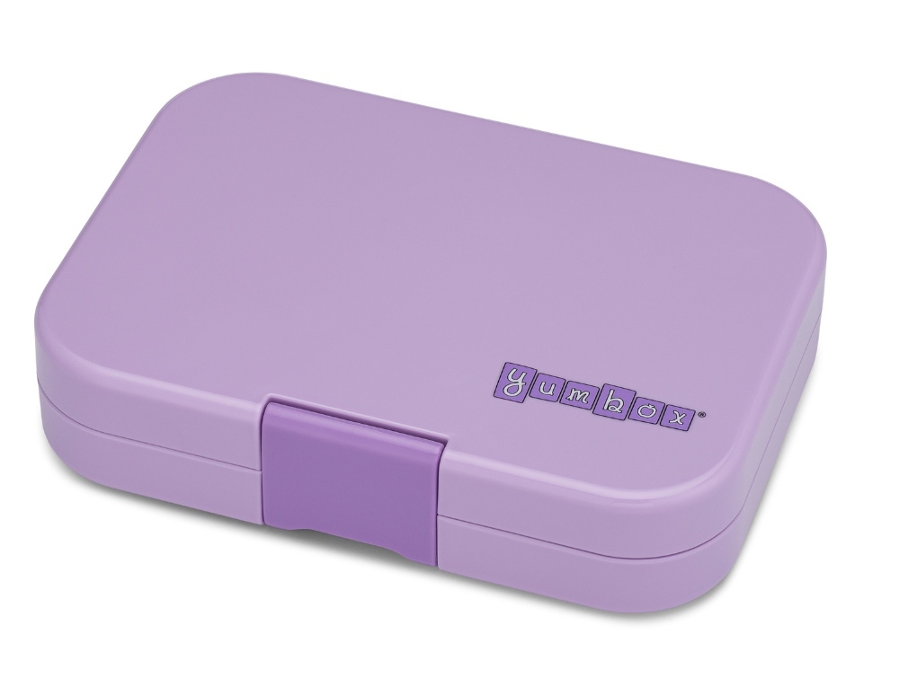 Yumbox Original madkasse i lavendel lilla med åben låg og unicornprint i inderbakkenYumbox Original madkasse i lavendel lilla med lukket låg og logo