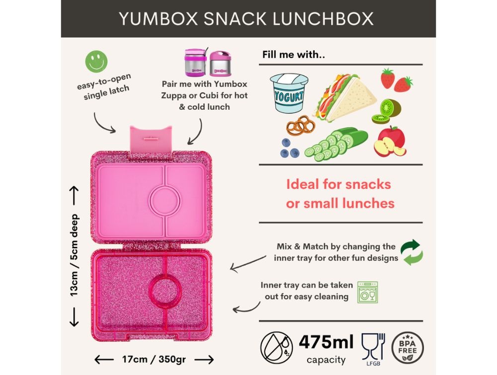 Yumbox Snack er en praktisk og kompakt madkasse, perfekt til mindre måltider eller snacks på farten. Den smarte rumopdeling holder forskellige fødevarer adskilt og frisk hele dagen.