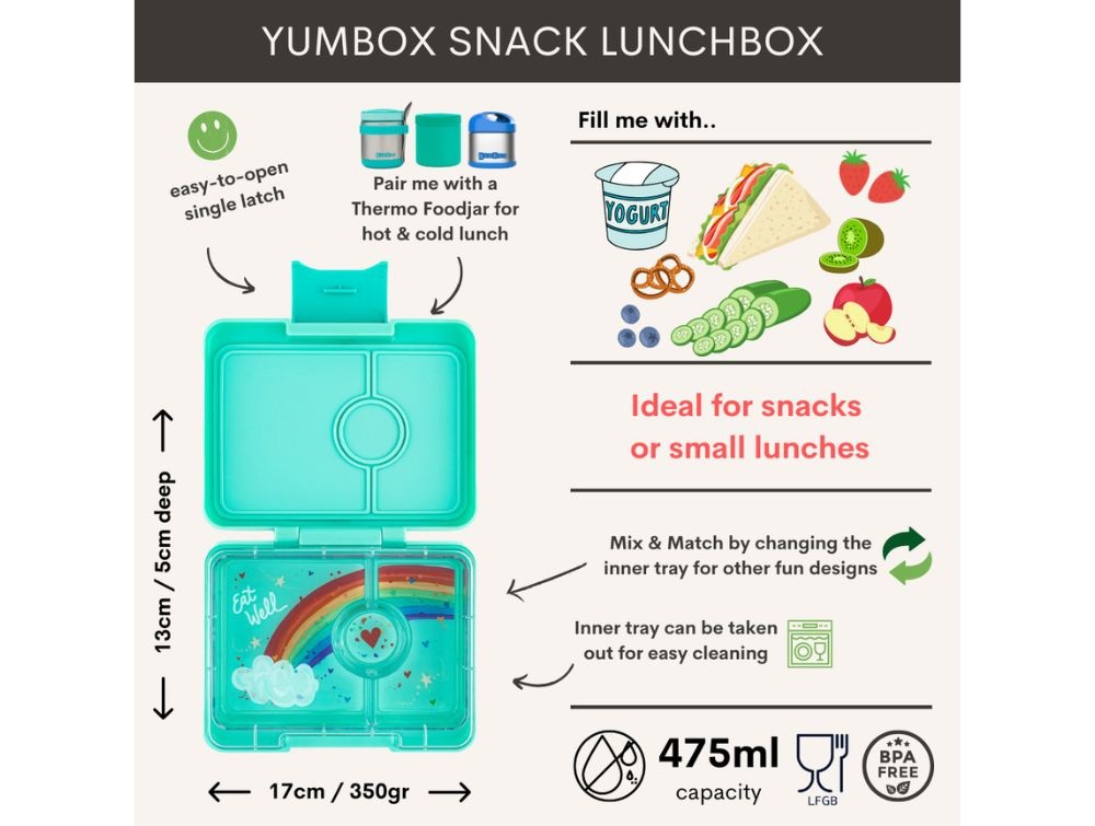 Yumbox Snack er en praktisk og kompakt madkasse, ideel til mindre måltider eller snacks på farten. Med sin smarte rumopdeling holdes forskellige fødevarer adskilt, så de forbliver friske og lækre hele dagen.