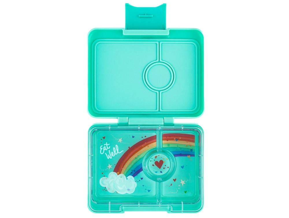 Bento madkasse med 3 rum i farven turkis med regnbue-print i inderbakken fra Yumbox.