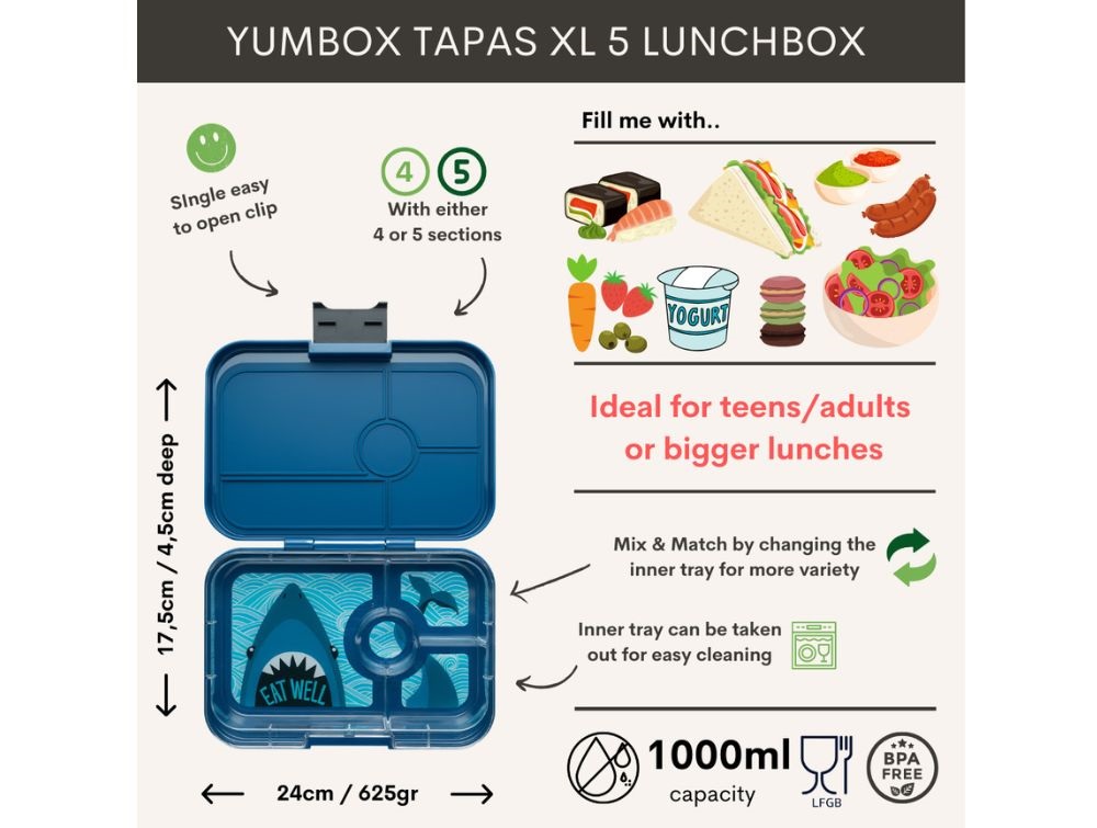 Tapas XL bento madkasse med 4 rum i blå med hajprint fra Yumbox.