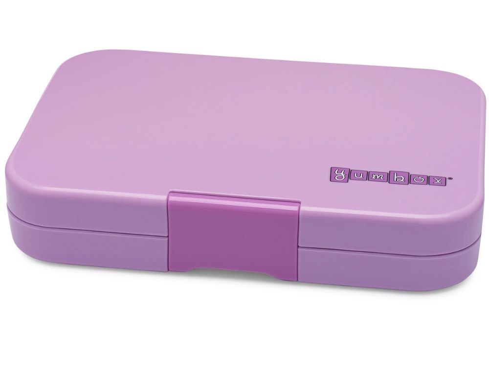 Stor og praktisk bento madkasse fra Yumbox i farven seville purple med en inderbakke dekoreret med et fint regnbueprint i pastelfarver. Madkassen har fire rummelige rum, der gør det nemt at pakke en varieret og sund frokost med plads til alt fra sandwiches og grøntsager til yoghurt og dip.