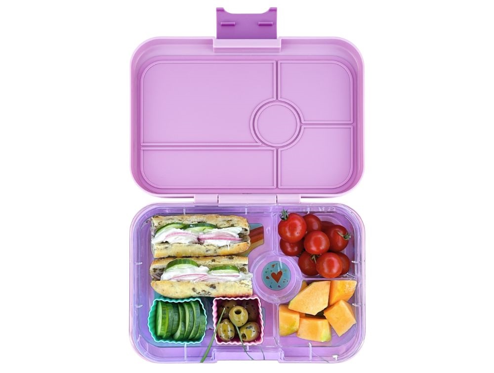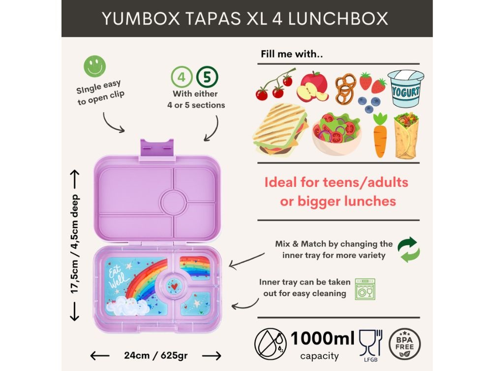 Tapas XL bento madkasse med 4 rum i seville purple med regnbueprint fra Yumbox.